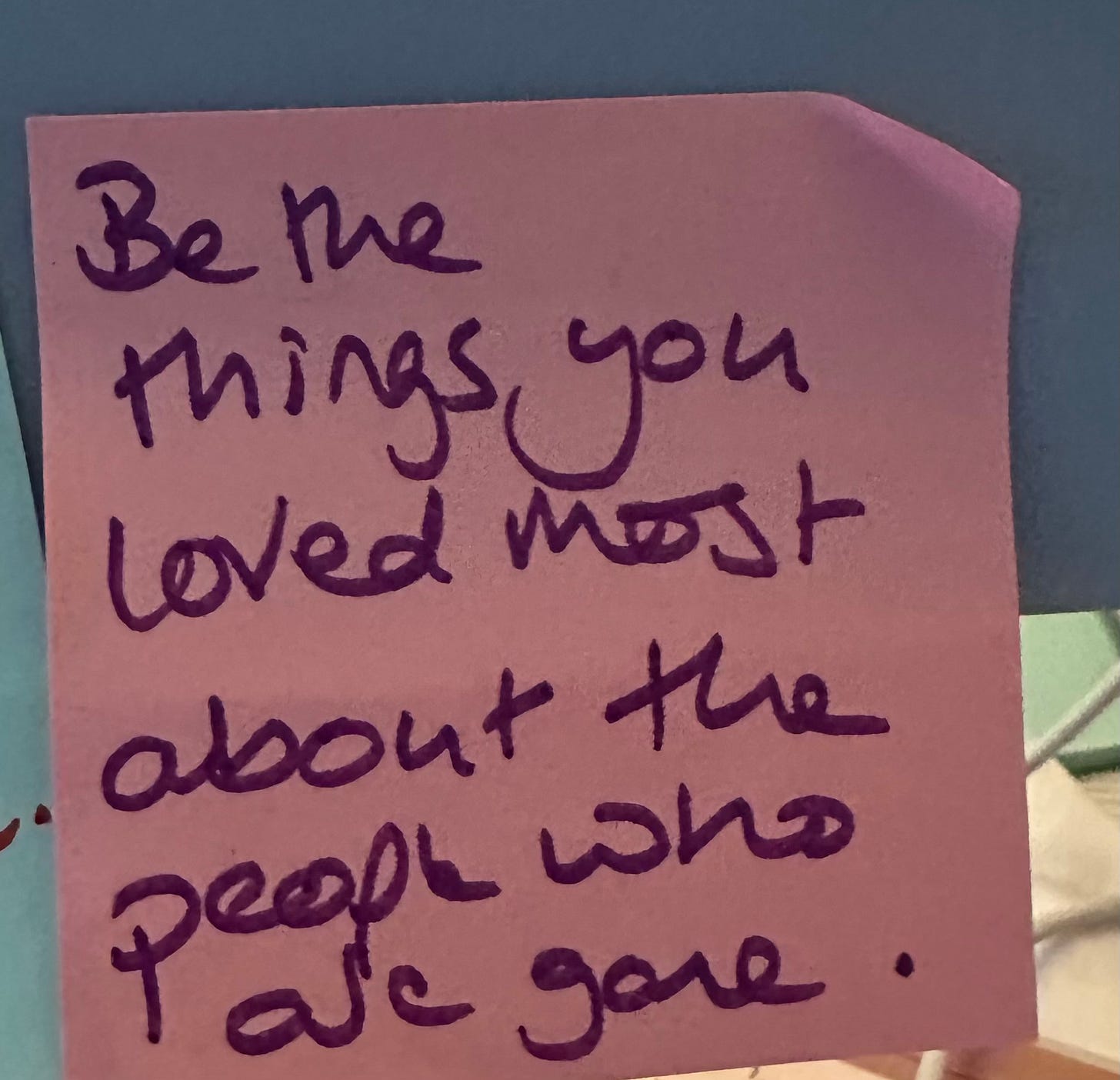 I was wondering why; and then I realised that this post-it note has been stuck to my computer screen since February, when my bereavement counsellor said it to me: Be the things you loved most about the people who are gone.