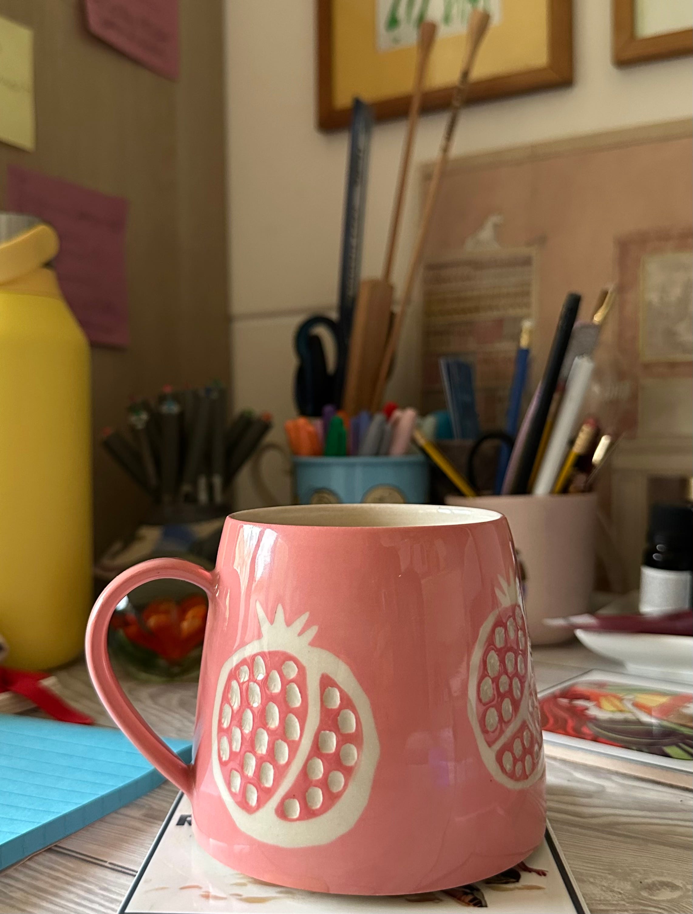I went to a craft fair to do a bit of Christmas shopping. Which accidentally included buying a mug for myself. It is SO beautiful, and (I suspect) strongly implicated in my current writing jubilation. And there should be more pomegranate themed items about. (We’re over Katherine of Aragon by now, surely?) Though I may be biased because I love almost all fruit above almost**** everything else. (You can keep your bananas and Granny Smith apples, thanks all the same.)