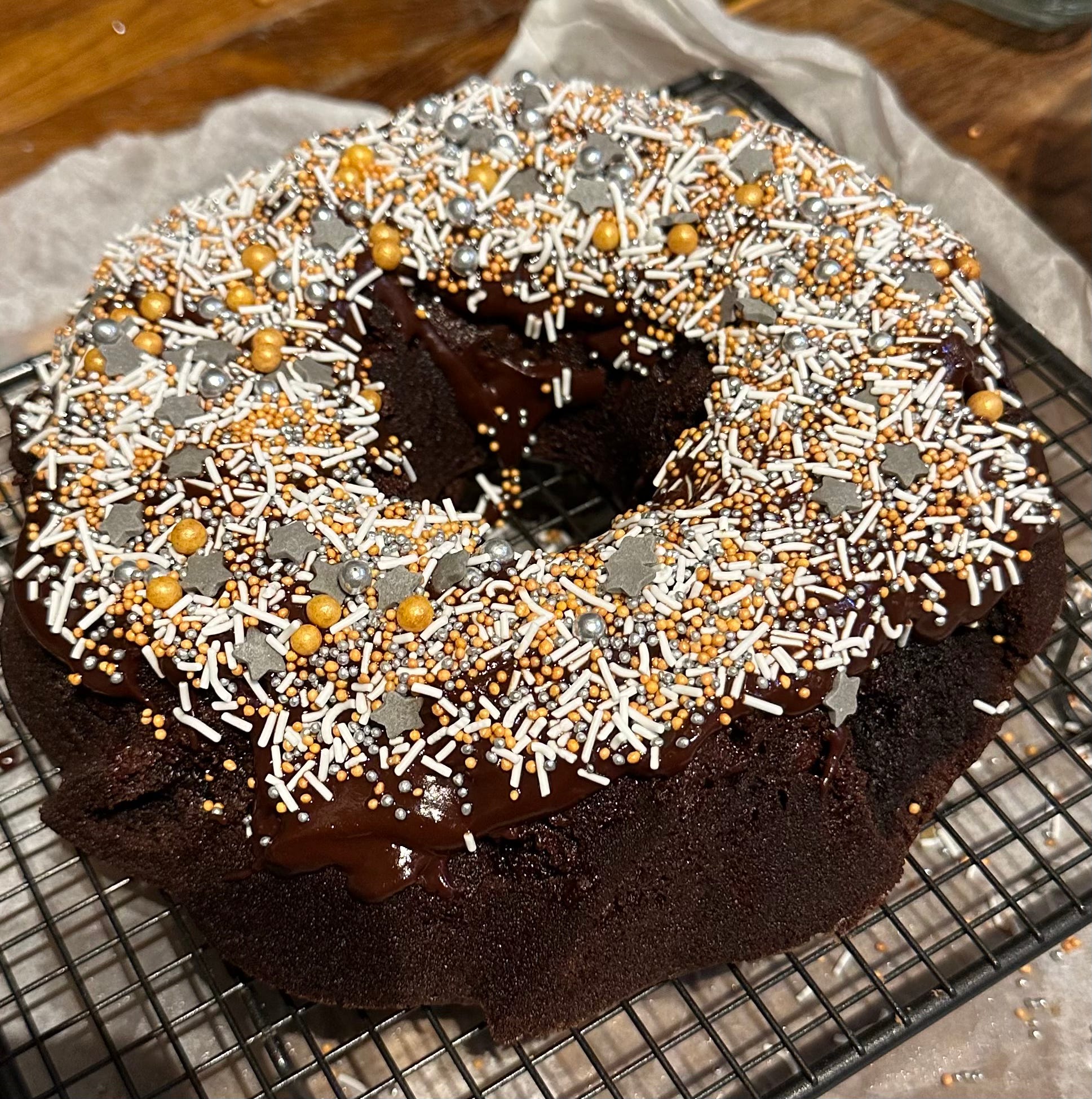 Cookery tip of the week: if you don’t bake your chocolate bundt cake for quite long enough, and it sticks to the tin, just cover it with glaze and then encrust the glaze with that tub of out-of-date sprinkles****** you found during the pre-Christmas there-must-be-some-treacle-in-here-somewhere cupboard rummage.